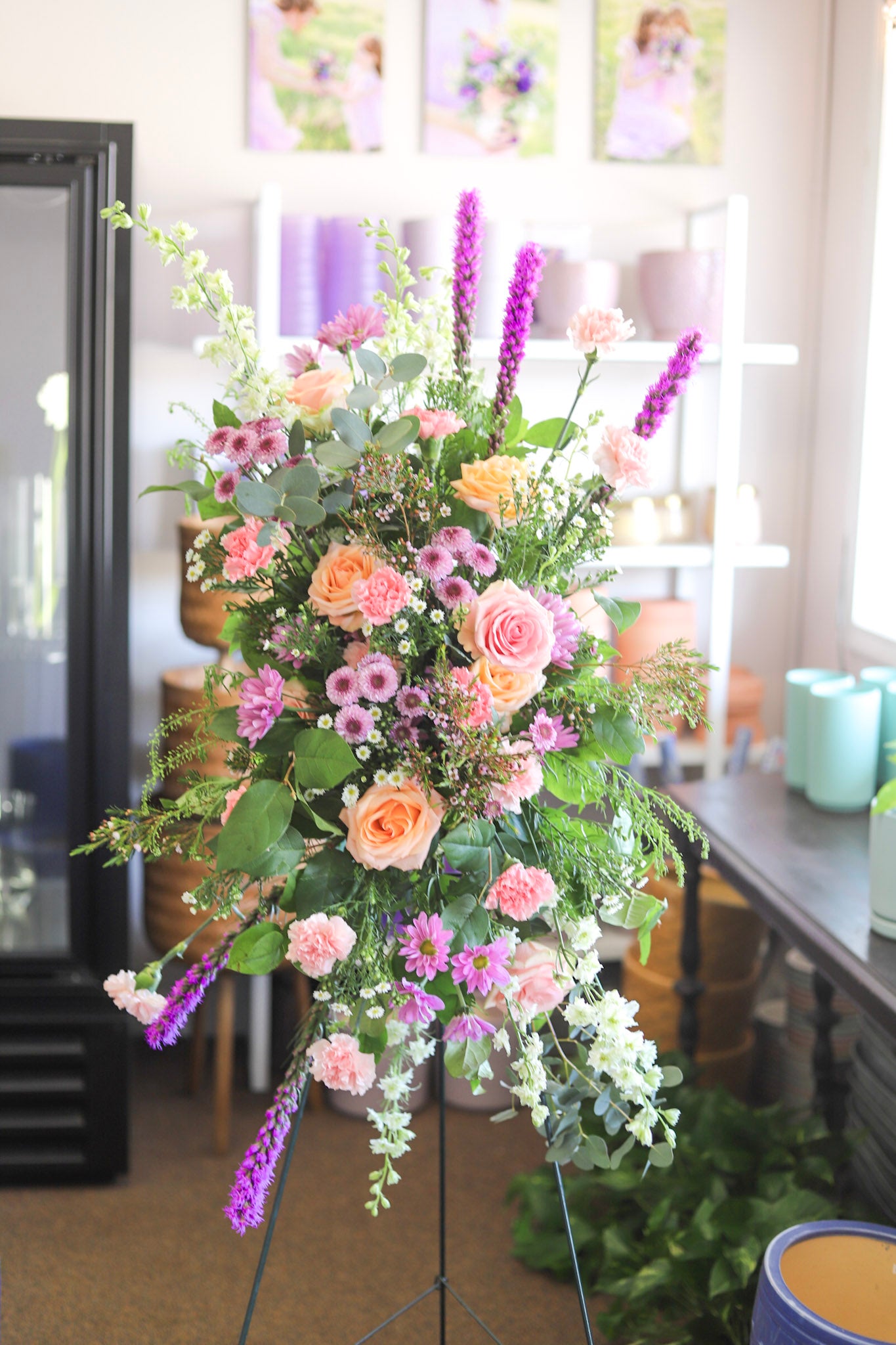 I can guide you through the process of deciding on color combinations and flower styles. Iโll even incorporate personal momementos, such as a hat from a beloved sports team or a pair of favorite cowboy boots. Itโs an honor to create a one-of-a-kind arrangement for a funeral.