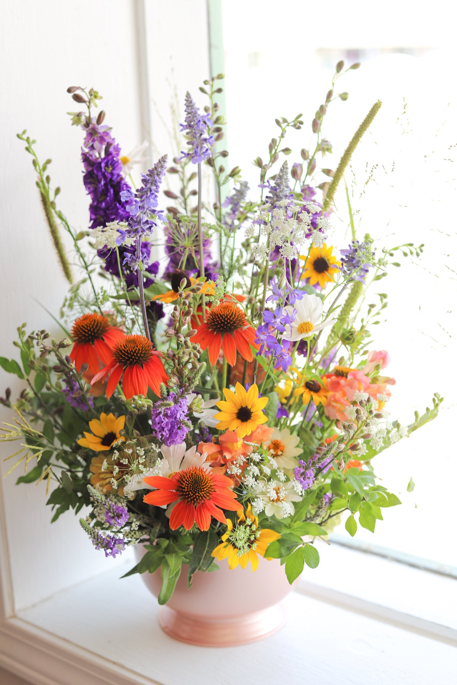 This floral design, ordered from our website called "Garden in a Vase" was designed with our homegrown flowers and delivered to a funeral as a heartfelt sympathy arrangement.